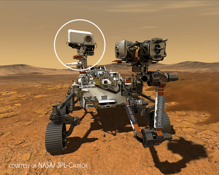 We’re delighted to be part of the SuperCam instrument, a combined camera, laser and spectrometer designed to look for organic compounds that could be clues of possible past life on the planet. It is able to make measurements and identify chemical and mineral targets as small as a pencil point from up to 20 feet away. More information here.