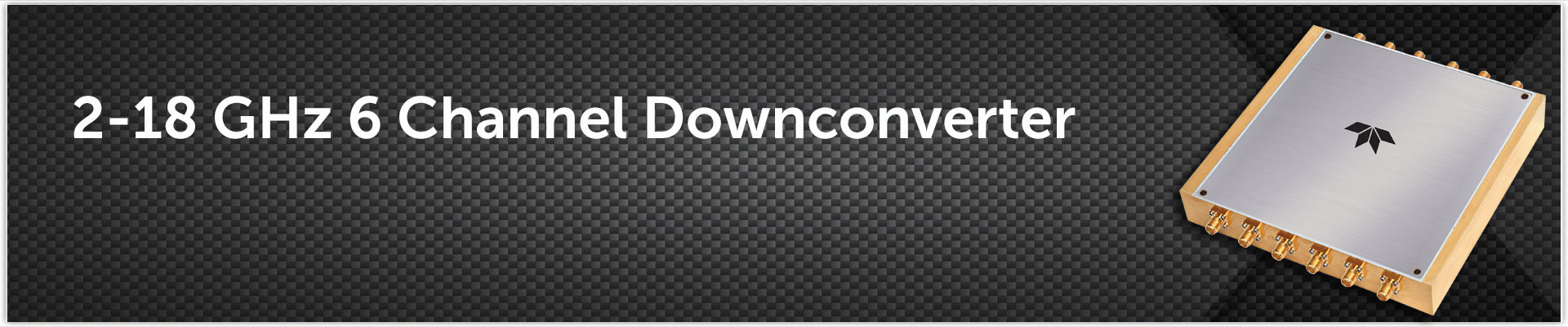 Teledyne RF & Microwave's Six Channel 2 - 18 GHz (RF and LO) downconverter operates with an IF of ~960 MHz, providing 25 dB of RF-IF gain, and bandwidth of ~500 MHz. This downconverter operates on a single LO at -6 dBm which is amplified, split, then again amplified to each of the 6 channels. Integrated into each channel is a range extension switch, controlled by a TTL input and adding 20 dB attenuation. Noise figure is ~ 13.5 dB and output IP3 is ~ +25 dBm. The downconverter is 2- sided, hermetically sealed and designed for rugged applications.